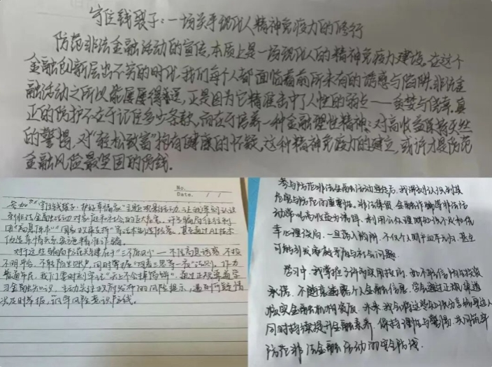 观影后,同学们纷纷聚焦非法金融活动的危害与手段,书写下自己的心得体会。从观后感中,能清晰看到同学们防非意识的觉醒与成长。大家深刻认识到,非法金融活动手段多样,“虚假项目”“熟人诱导”极具迷惑性,不仅威胁个人财产安全,更冲击金融秩序。有同学反思生活中接到的“中奖”“刷单返利”电话,坚定表示要时刻保持警惕,不被高收益迷惑;还有同学从金融理性精神角度出发,提出要培养对“轻松致富”的怀疑态度,构建抵御风险的“精神免疫力”。